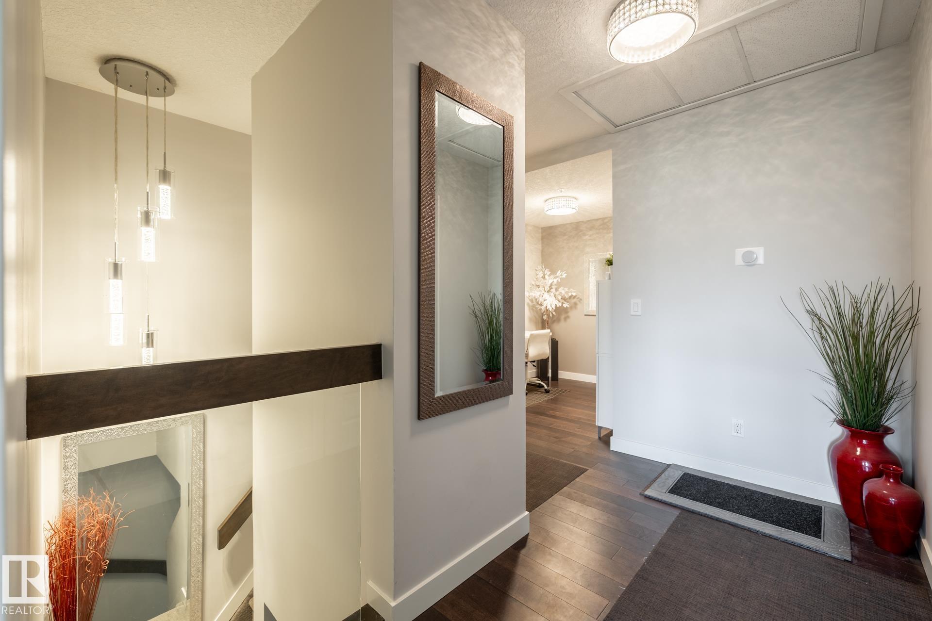 Large Executive 2-storey Townhouse style condo. It has it's own underground Attached Double Garage (heated). Park your vehicle and walk into your Executive Condo. Three Bedrooms (2 with ensuite bathrooms), 3 full Bathrooms, an office/den on upper level. Laundry room in suite in the upper area. A huge Kitchen will appeal to those who like to entertain. The L-shaped counter seats at least 8-10 people. Large pantry next to kitchen. A large Dining area. A double-sided electric fireplace will make those evenings very relaxing. Large south-facing walk-out patio (2 access doors to the patio/deck). Main level has views of the pond and walking area/park. Very quiet unit. These very large Executive Condos do not come on the market often. Take a look, and you will see for yourself. It is worth the time.