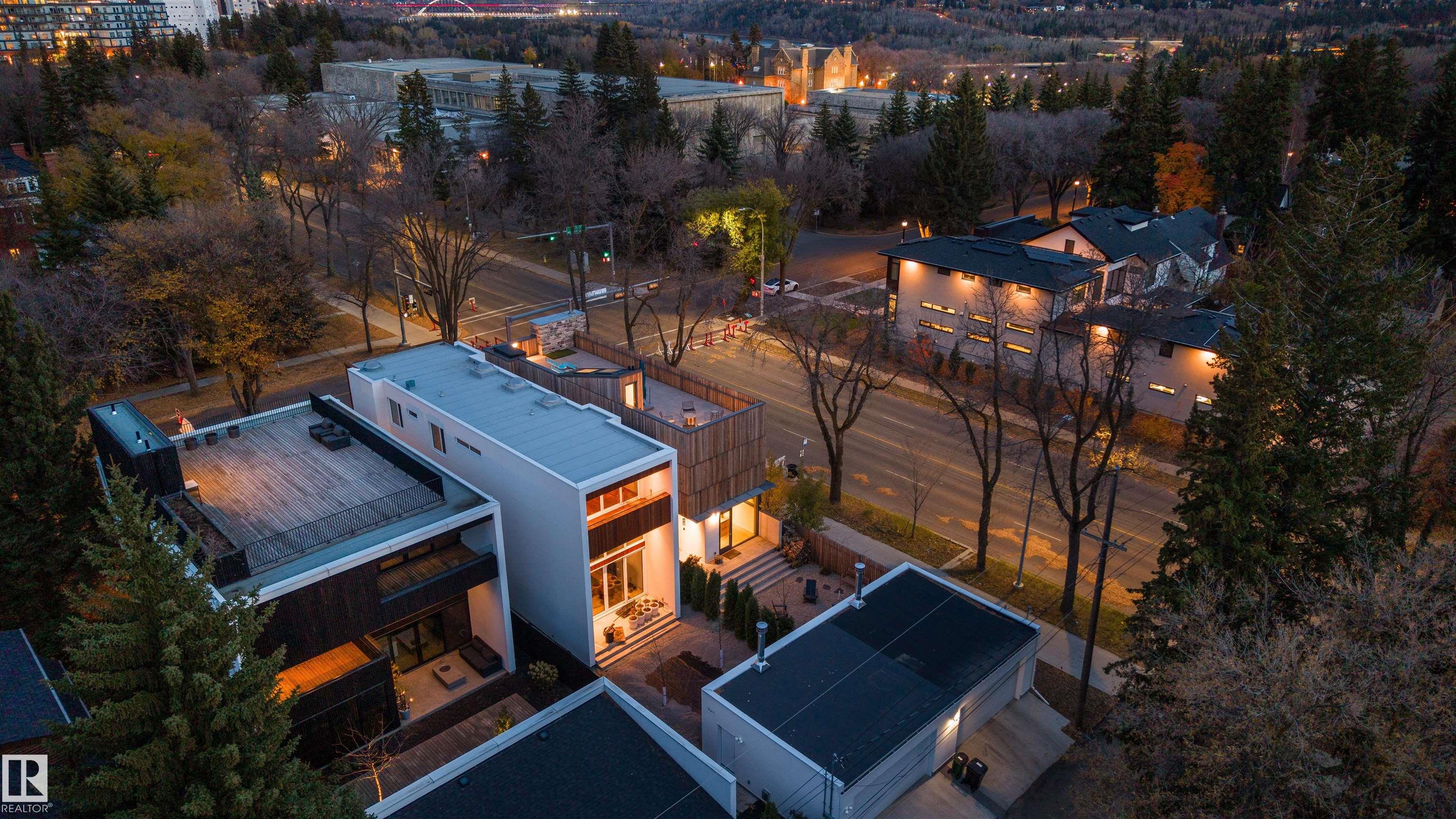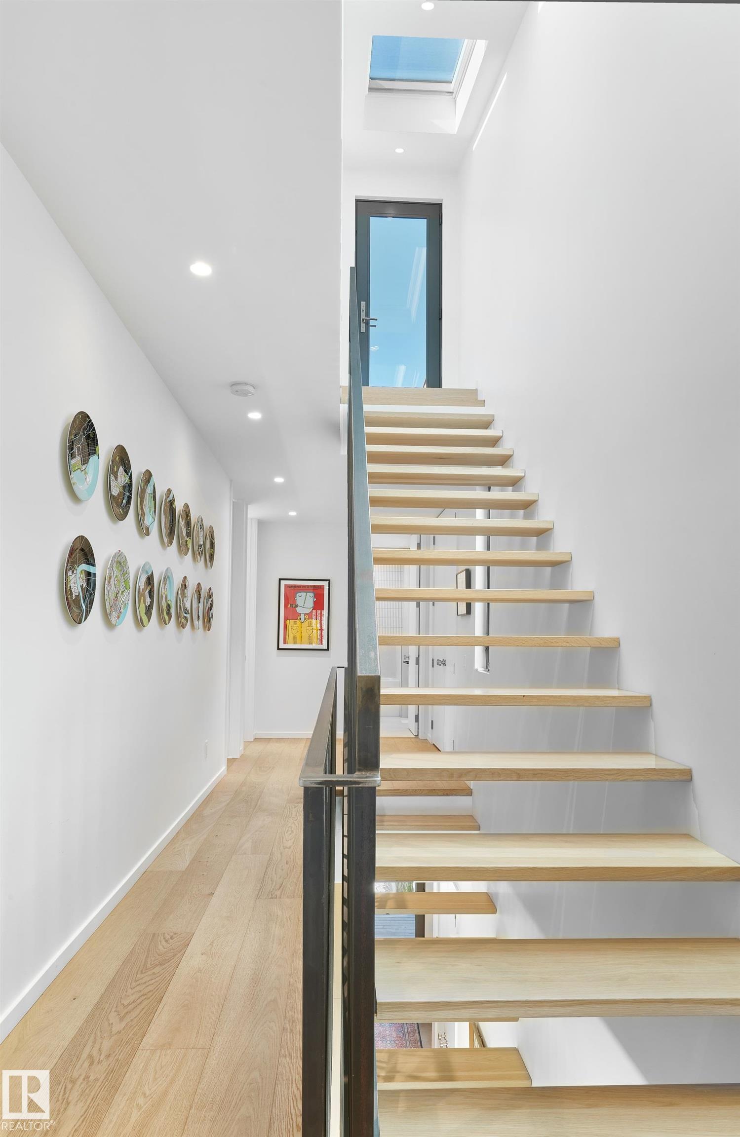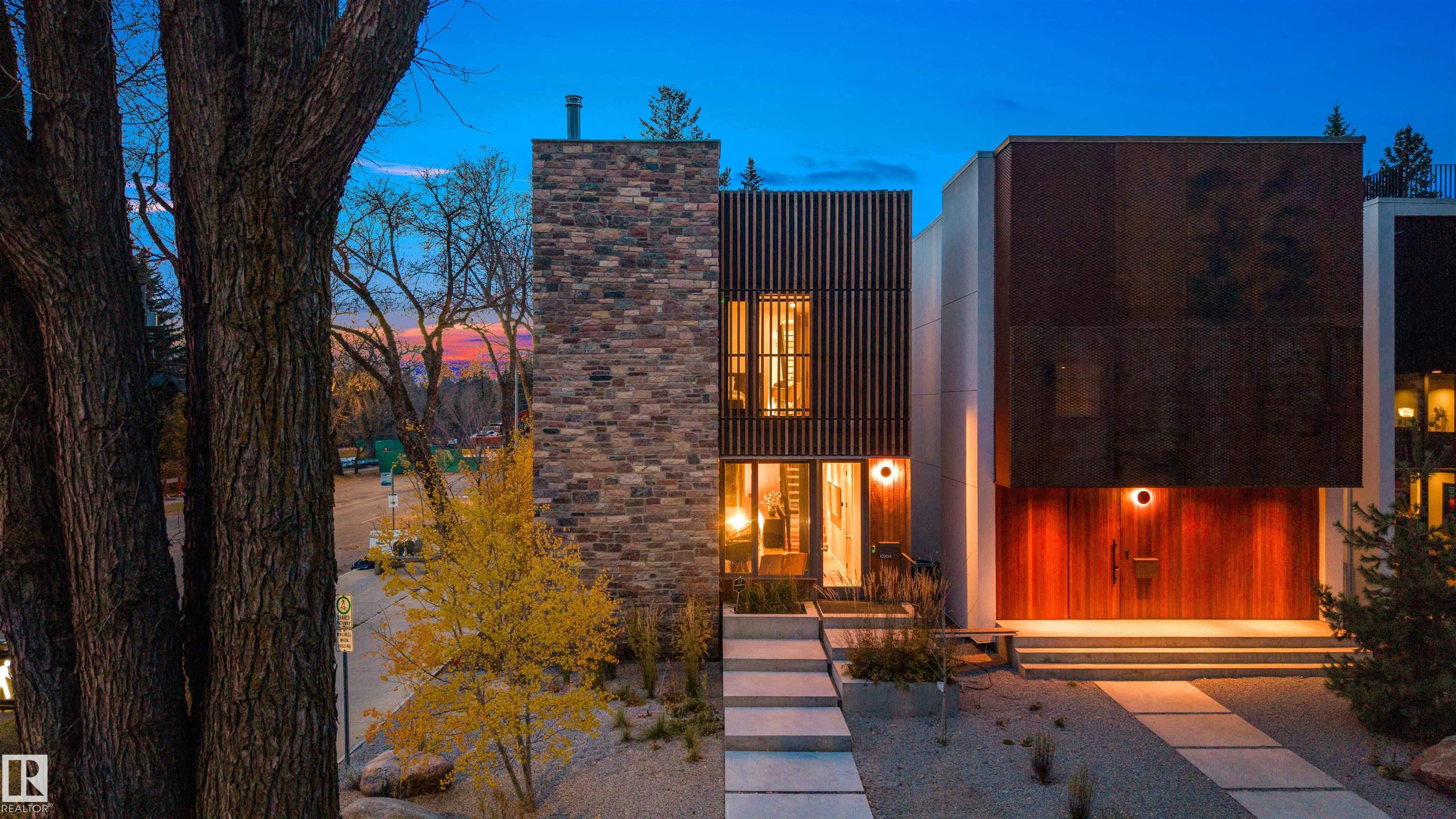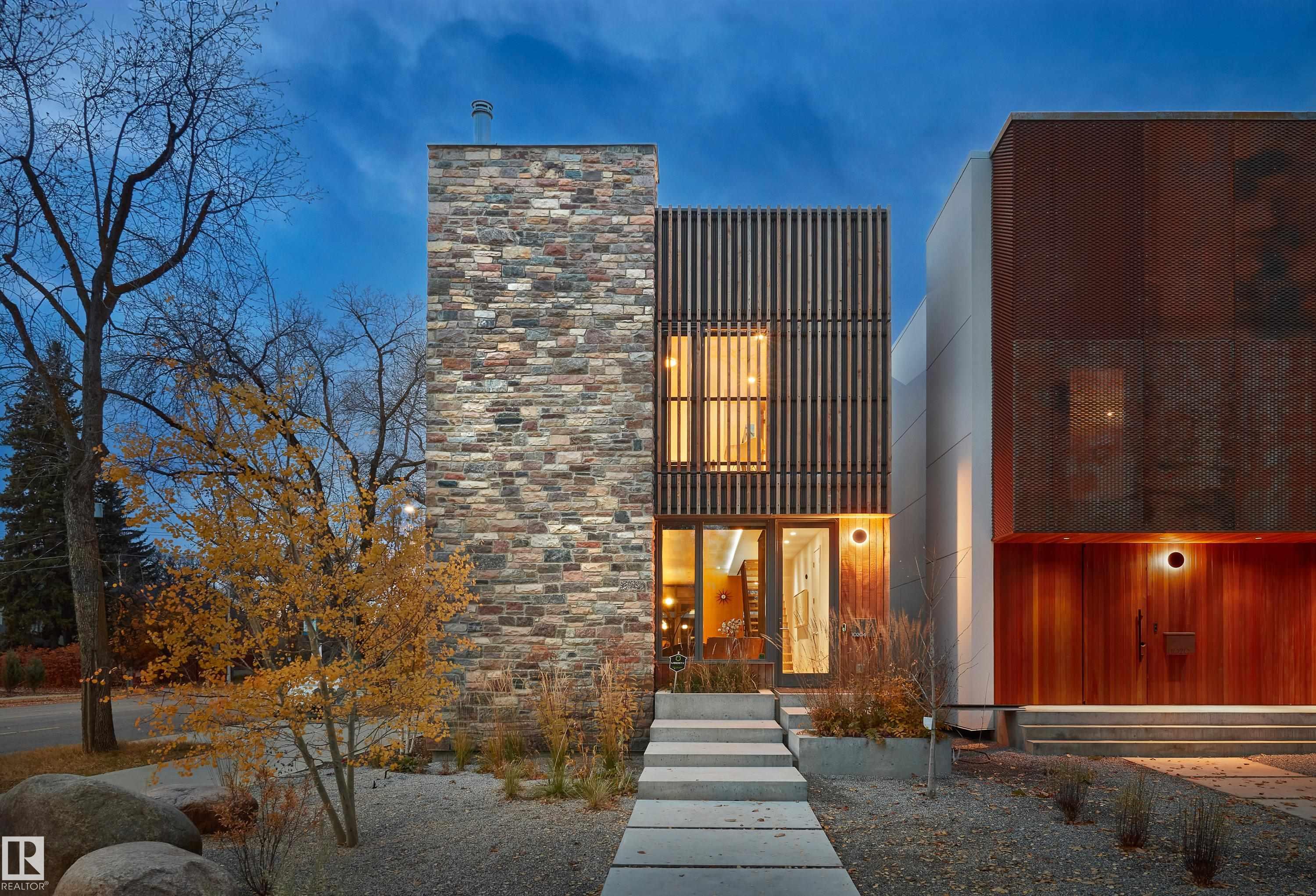 Designed by Edmonton City Architect Carol Belanger, this remarkable Old Glenora residence reinterprets the low-slung modernist home that once stood on the site. With over 2,800 sq. ft. of finished living space, it balances heritage and innovation with quiet confidence. The striking stone chimney, painstakingly rebuilt from salvaged materials, anchors the home in its history while defining a new architectural chapter. Inside, a luminous ribbon window traces the south fa‡ade, framing open horizons and intimate moments in equal measure. Wrapped in warm wood and textural stone, the upper level appears to float, a refined nod to a modern tree fort. Light shifts gently across each surface throughout the day, revealing new tones and textures. Every material, polished concrete, natural textural wood, cold-rolled steel, and verdant tile, contributes to an atmosphere of enduring craftsmanship and understated luxury. This is contemporary Edmonton living, rooted in legacy and elevated by design.