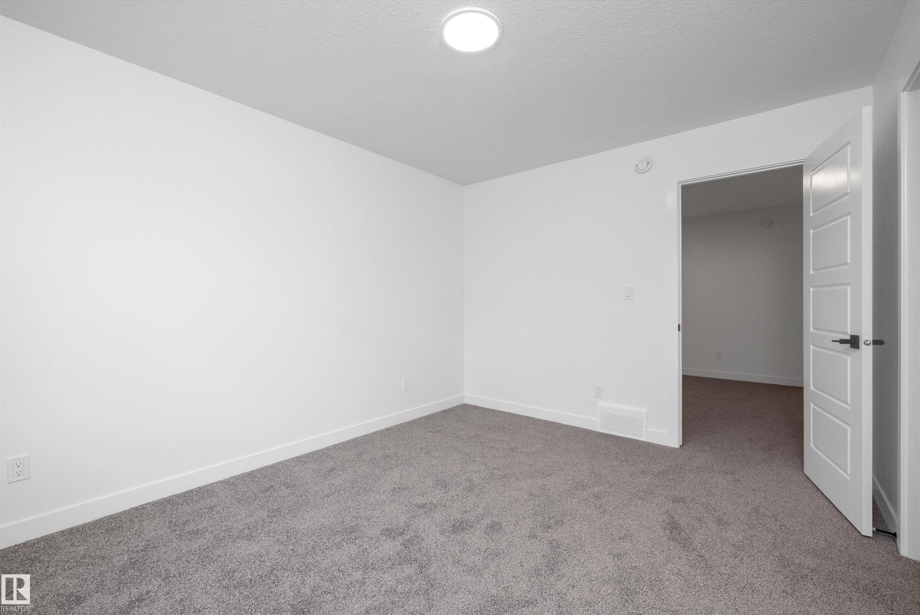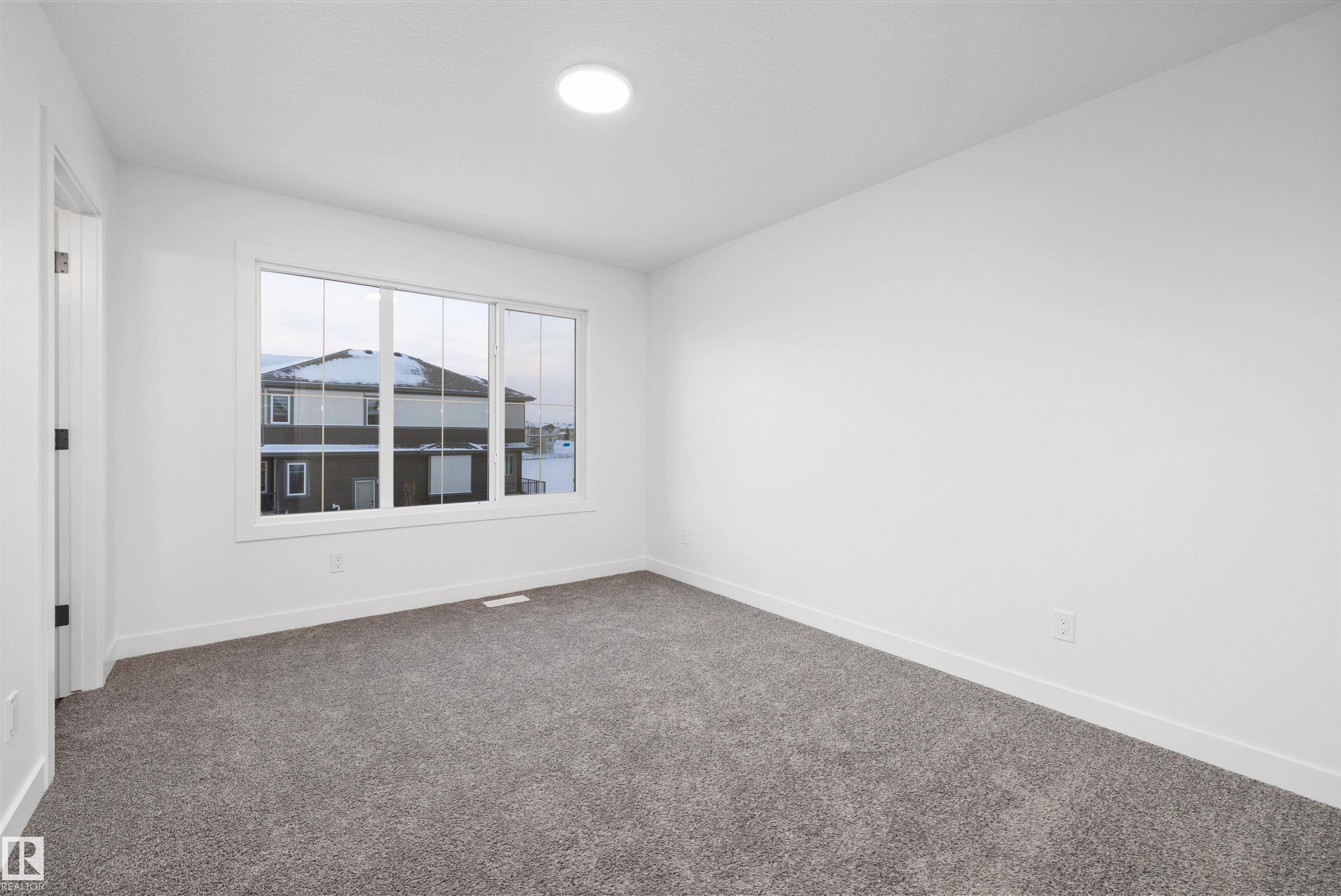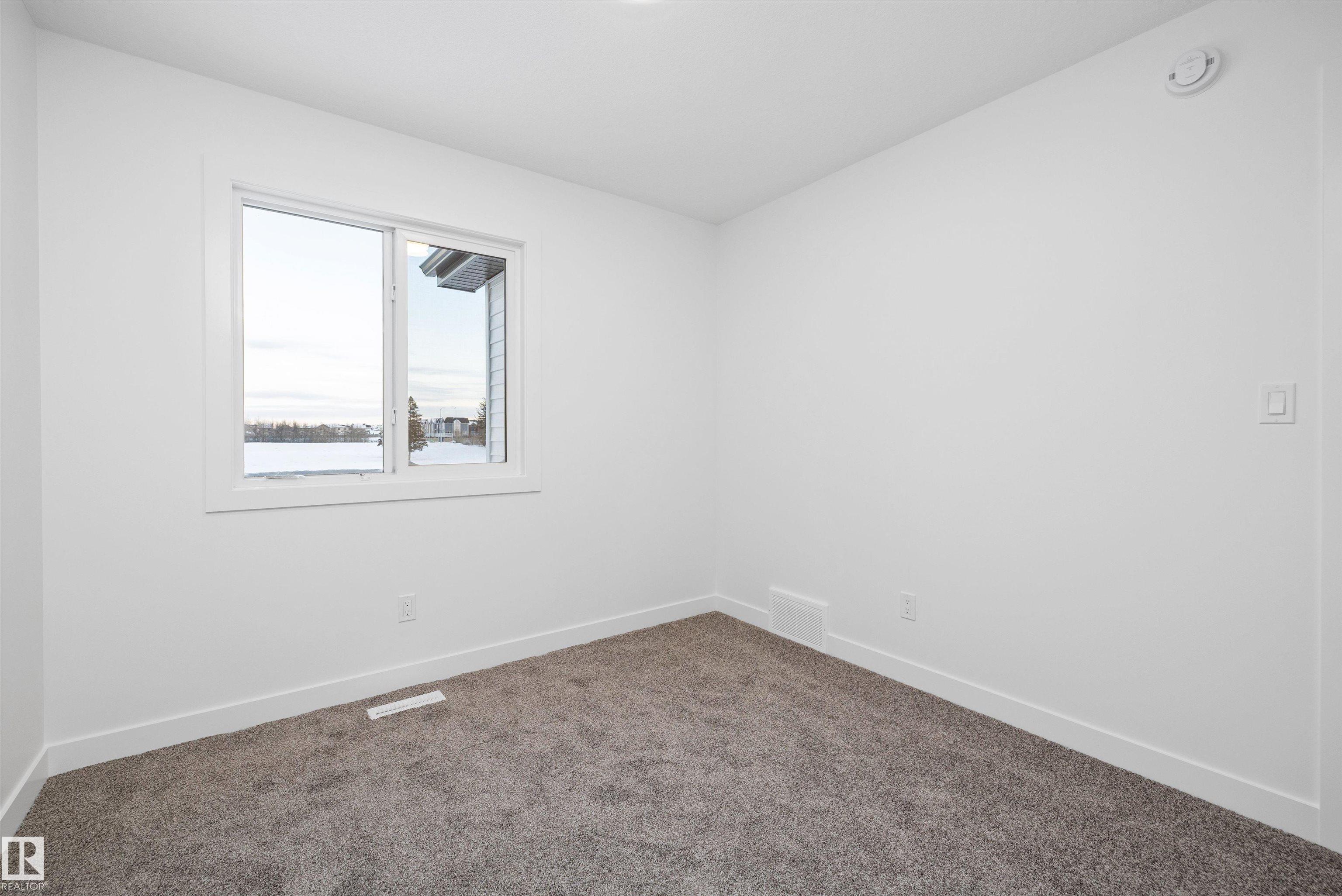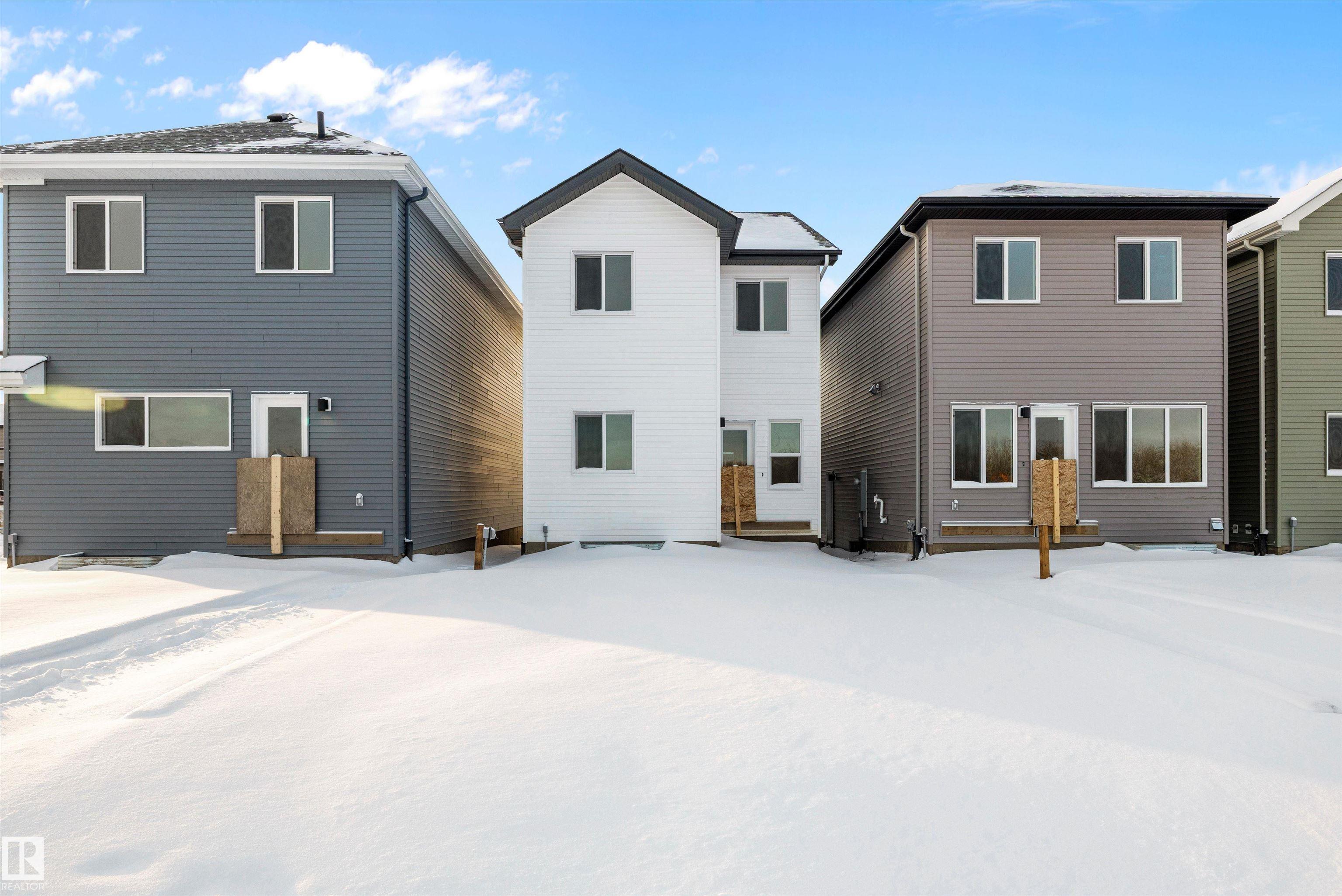 Welcome to the Sylvan by Sterling Homes, a smartly designed home with modern finishes and flexible living space. The main floor offers luxury vinyl plank flooring and 9' ceilings, starting with a welcoming foyer and coat closet that opens into a bright great room. The kitchen features quartz countertops, an island with flush eating ledge, Silgranit undermount sink, pendant lighting, over-the-range microwave, soft-close upgraded cabinetry, and a pantry near the stairs. At the rear, a sunlit nook overlooks the backyard and sits beside a main-floor bedroom and 3-piece bath with stand-up shower, plus a garden door for outdoor access. Upstairs includes a primary suite with walk-in closet and 3-piece ensuite with tub/shower combo, two additional bedrooms, a full bath, and a laundry closet. 9' ceilings on main and basement levels, a separate side entrance, black plumbing and lighting fixtures, basement rough-in, and a parking pad with option for a detached double garage complete this home.
