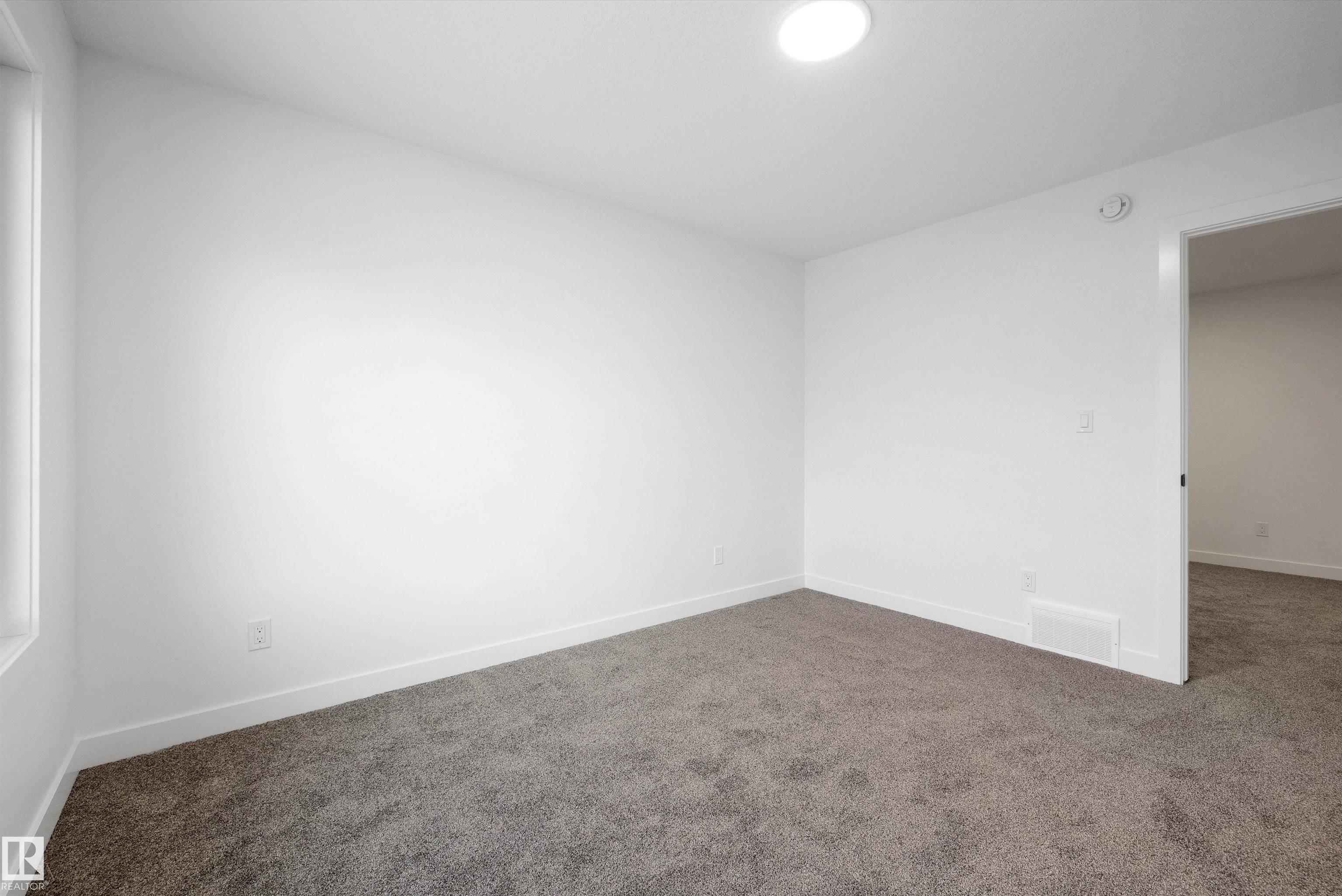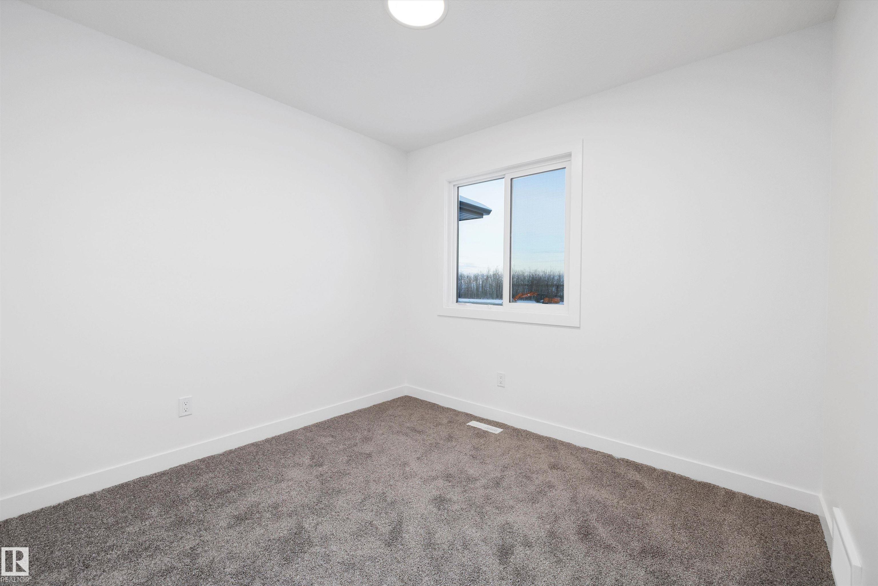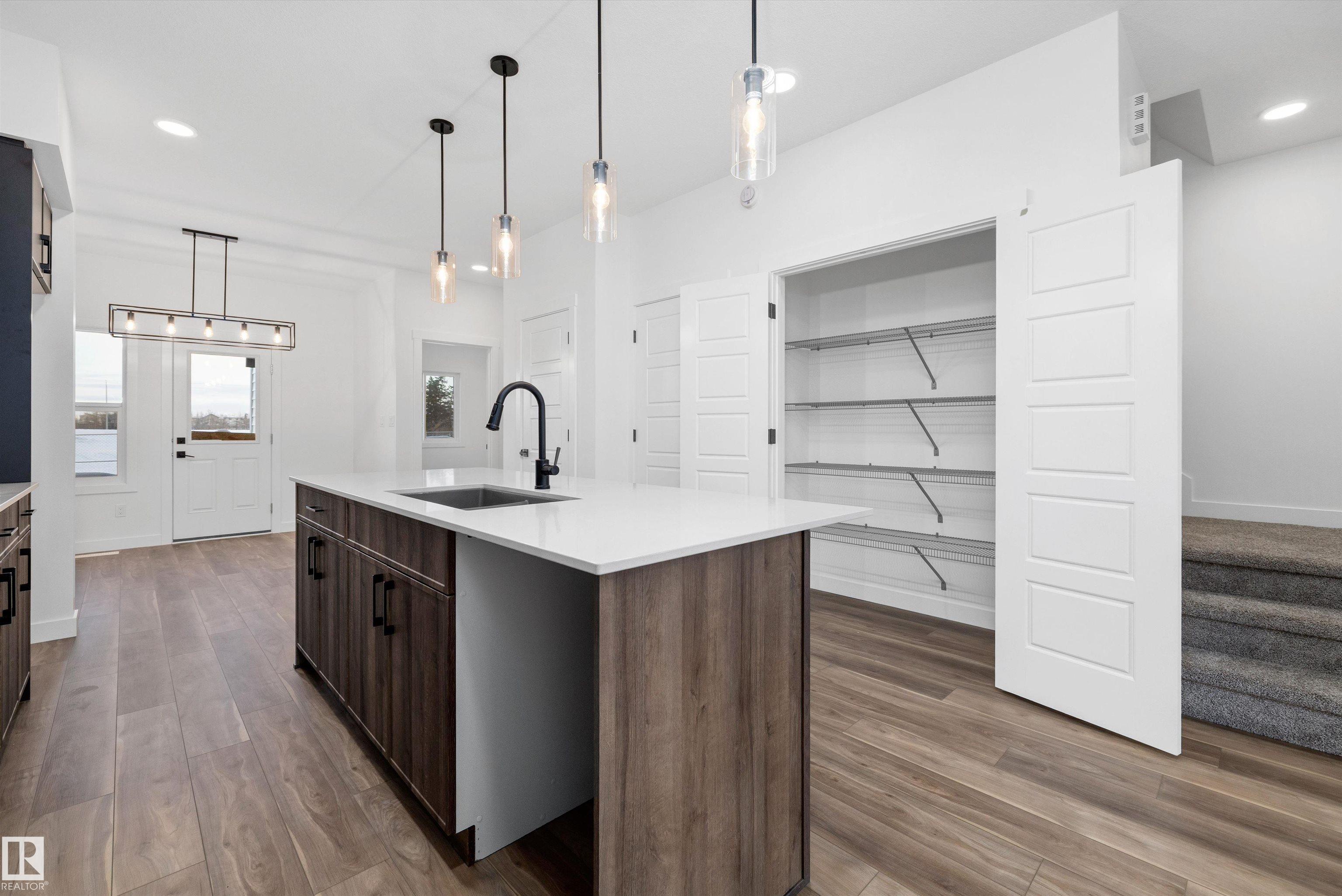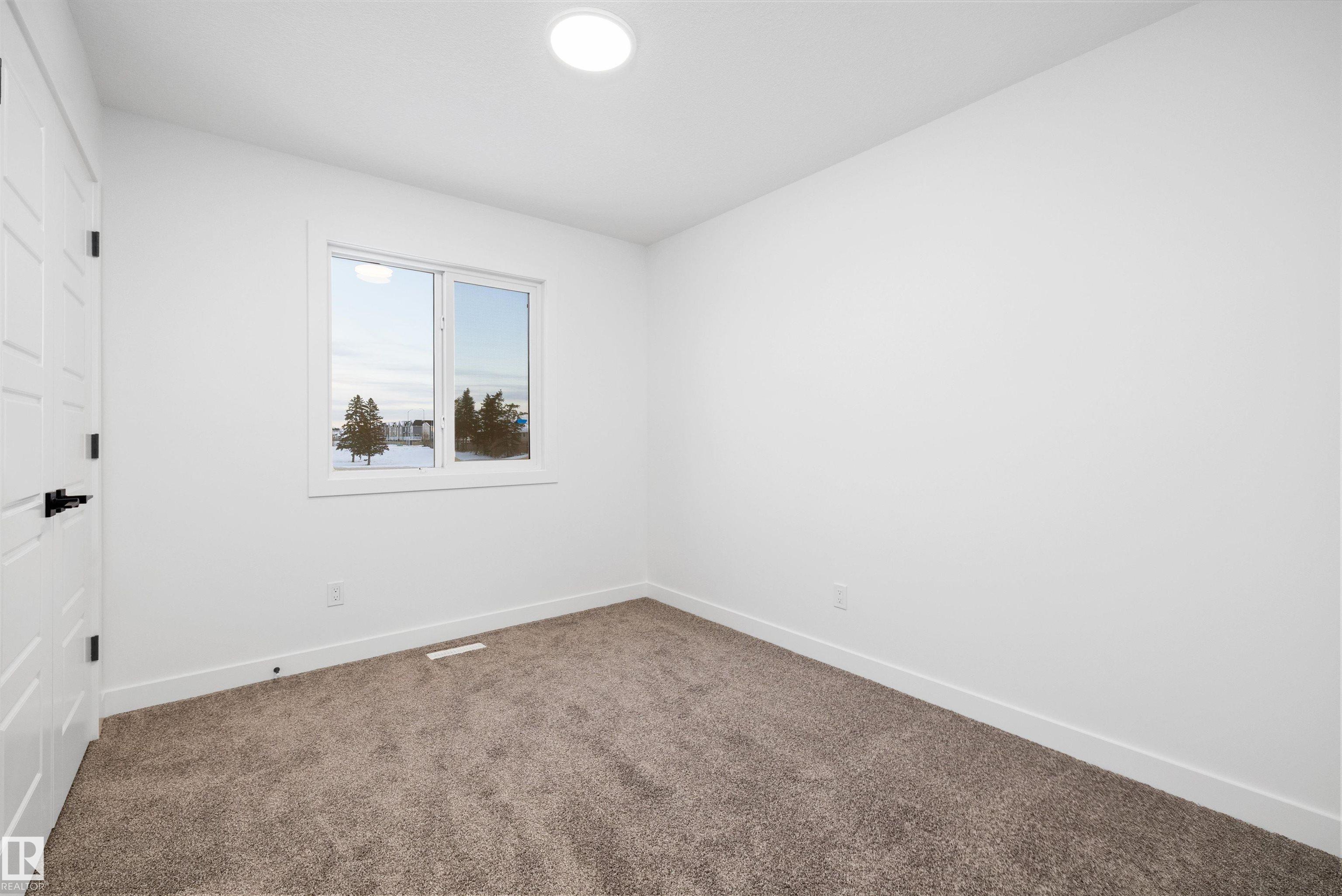 Welcome to the Sylvan by Sterling Homes, a smartly designed home with modern finishes and flexible living space. The main floor offers luxury vinyl plank flooring and 9' ceilings, starting with a welcoming foyer and coat closet that opens into a bright great room. The kitchen features quartz countertops, an island with flush eating ledge, Silgranit undermount sink, pendant lighting, over-the-range microwave, soft-close upgraded cabinetry, and a pantry near the stairs. At the rear, a sunlit nook overlooks the backyard and sits beside a main-floor bedroom and 3-piece bath with stand-up shower, plus a garden door for outdoor access. Upstairs includes a primary suite with walk-in closet and 3-piece ensuite with tub/shower combo, two additional bedrooms, a full bath, and a laundry closet. 9' ceilings on main and basement levels, a separate side entrance, black plumbing and lighting fixtures, basement rough-in, and a parking pad with option for a detached double garage complete this home.