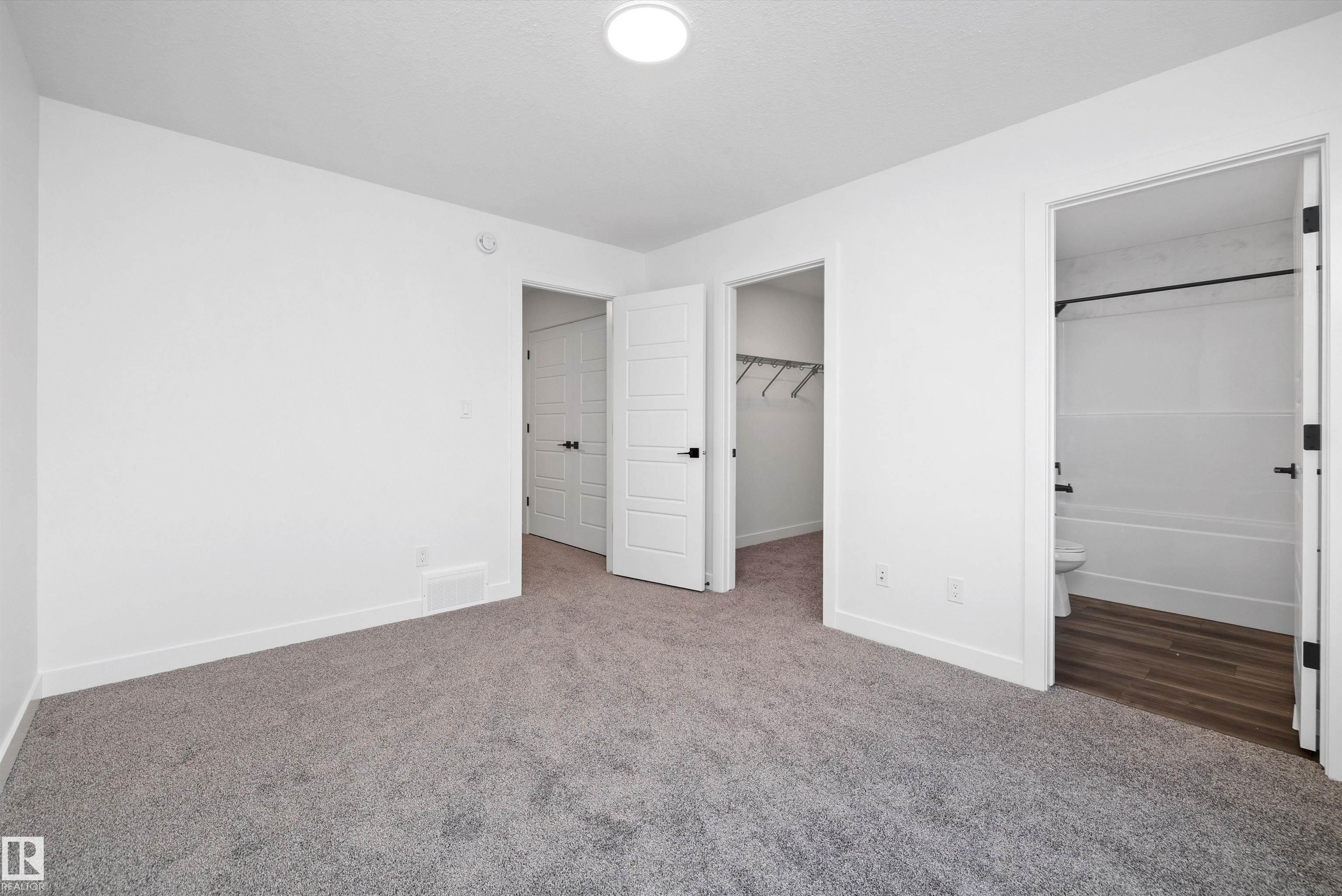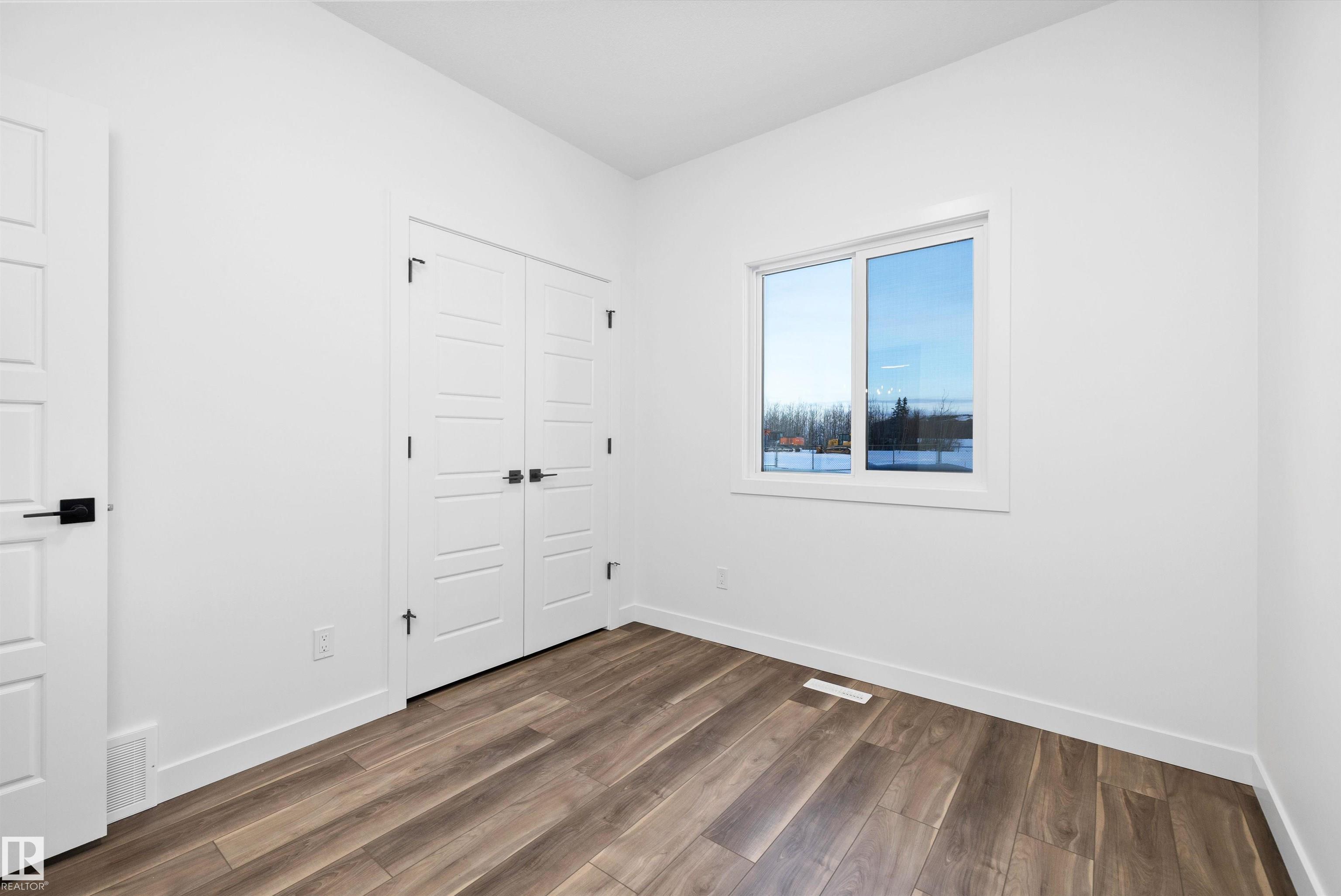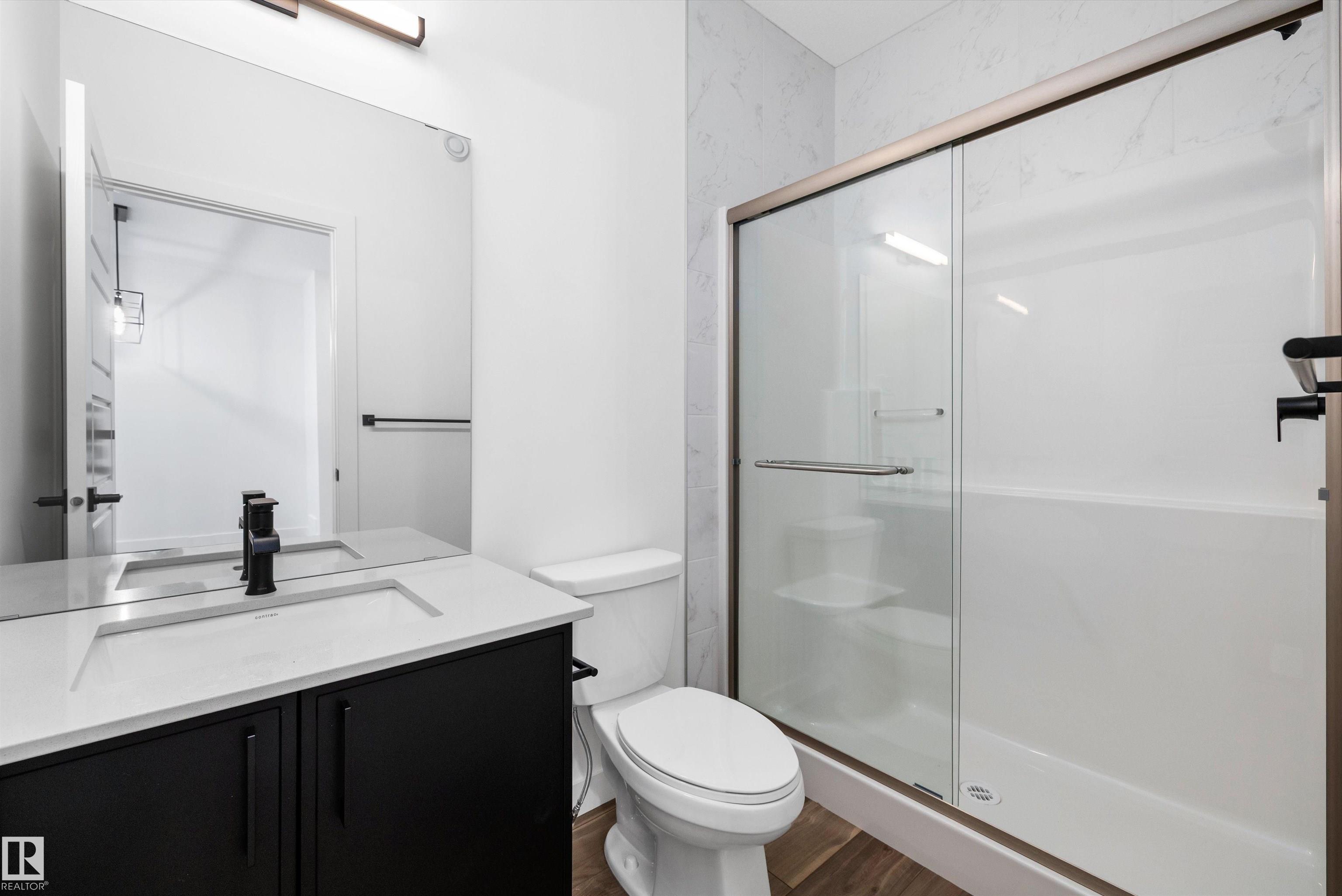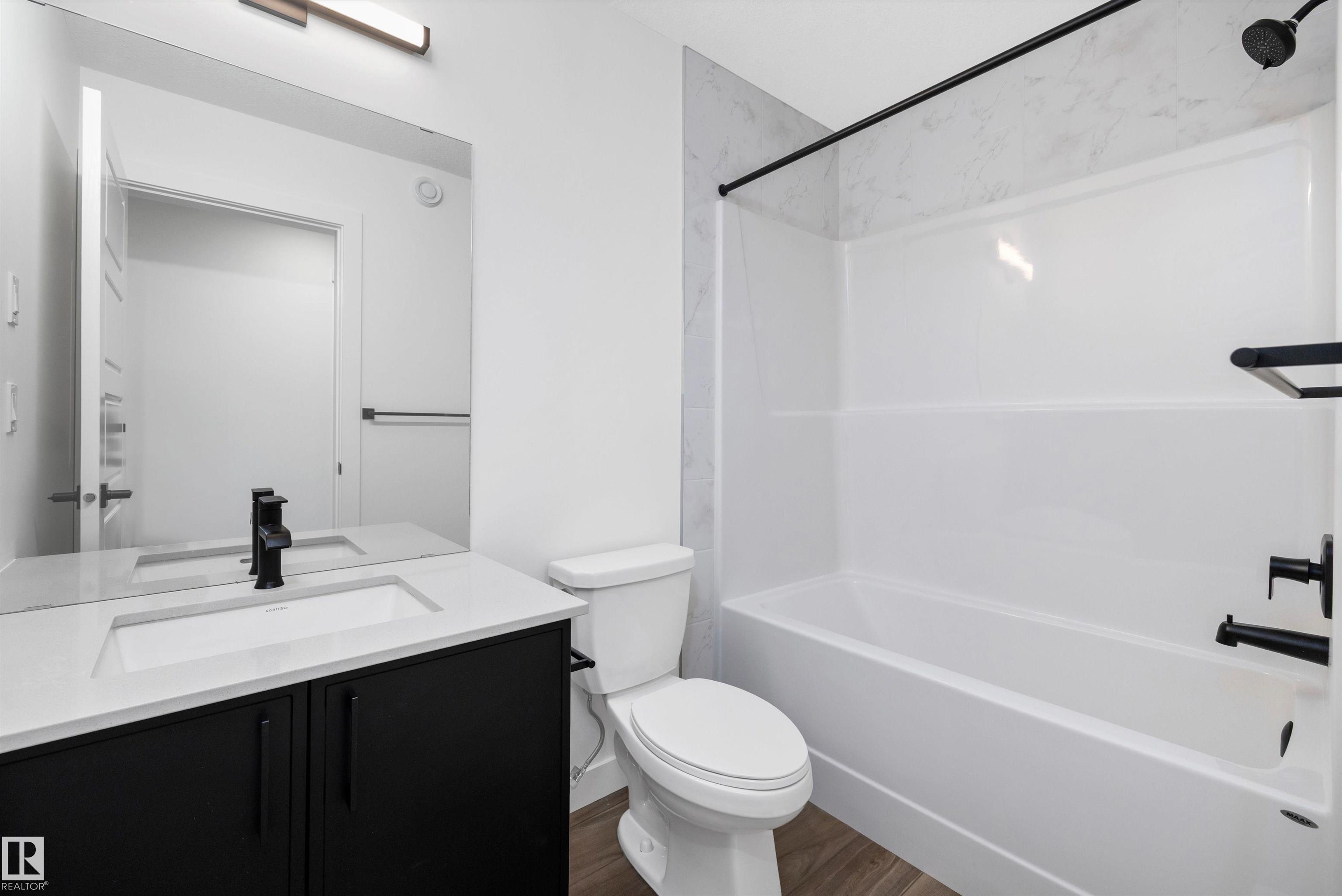 Welcome to the Sylvan by Sterling Homes, a smartly designed home with modern finishes and flexible living space. The main floor offers luxury vinyl plank flooring and 9' ceilings, starting with a welcoming foyer and coat closet that opens into a bright great room. The kitchen features quartz countertops, an island with flush eating ledge, Silgranit undermount sink, pendant lighting, over-the-range microwave, soft-close upgraded cabinetry, and a pantry near the stairs. At the rear, a sunlit nook overlooks the backyard and sits beside a main-floor bedroom and 3-piece bath with stand-up shower, plus a garden door for outdoor access. Upstairs includes a primary suite with walk-in closet and 3-piece ensuite with tub/shower combo, two additional bedrooms, a full bath, and a laundry closet. 9' ceilings on main and basement levels, a separate side entrance, black plumbing and lighting fixtures, basement rough-in, and a parking pad with option for a detached double garage complete this home.