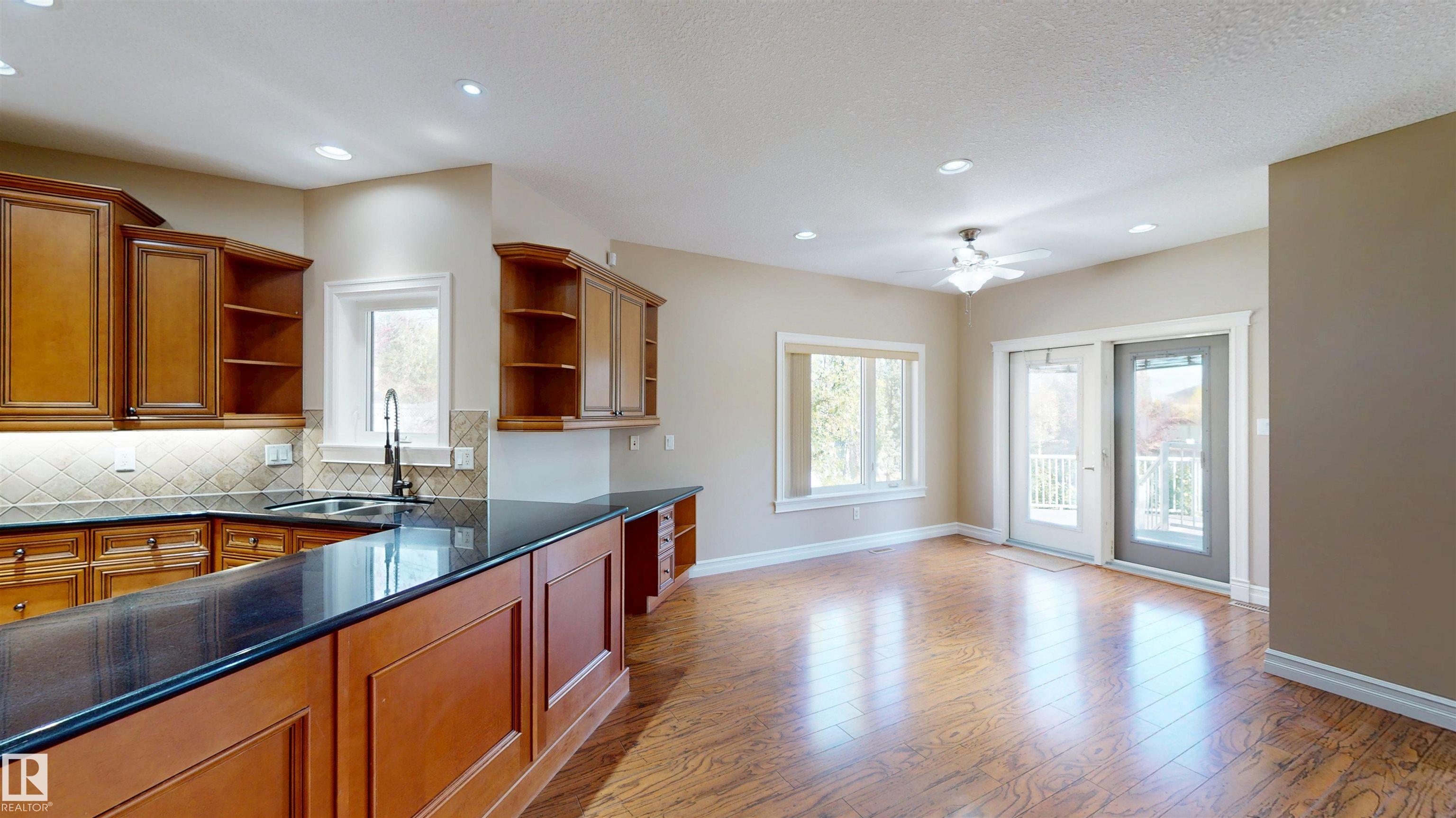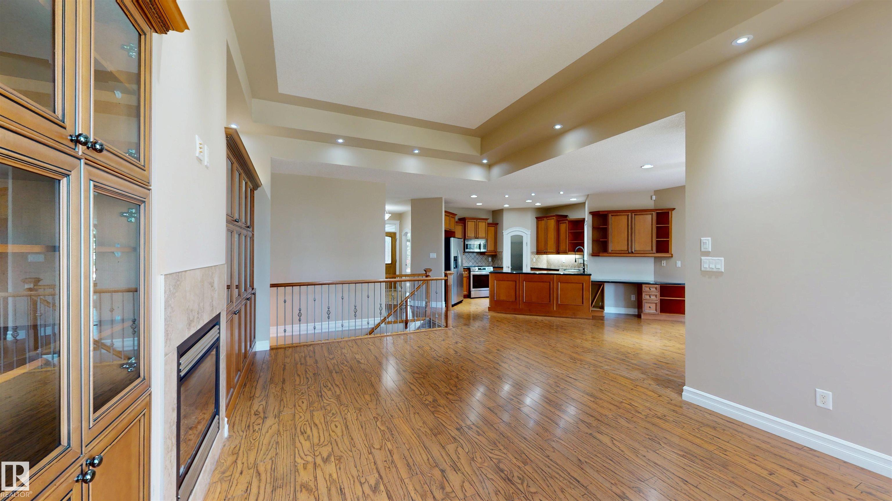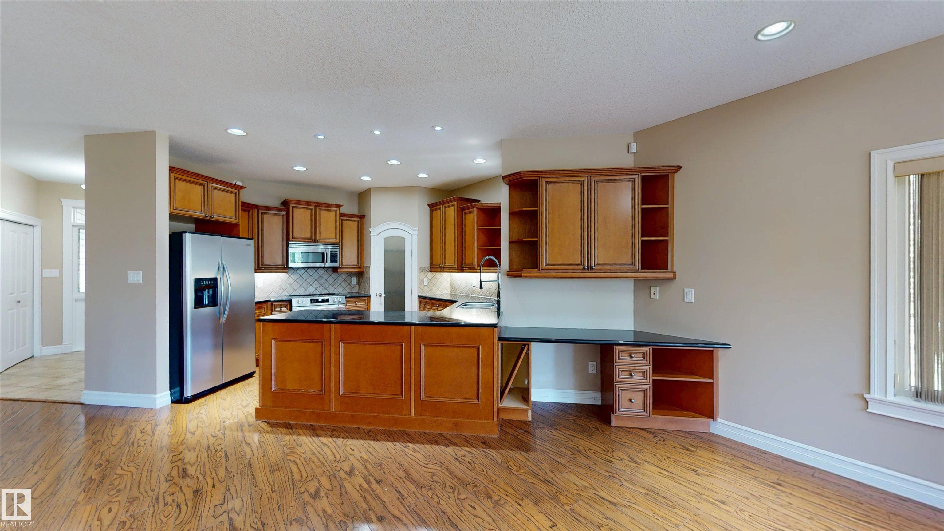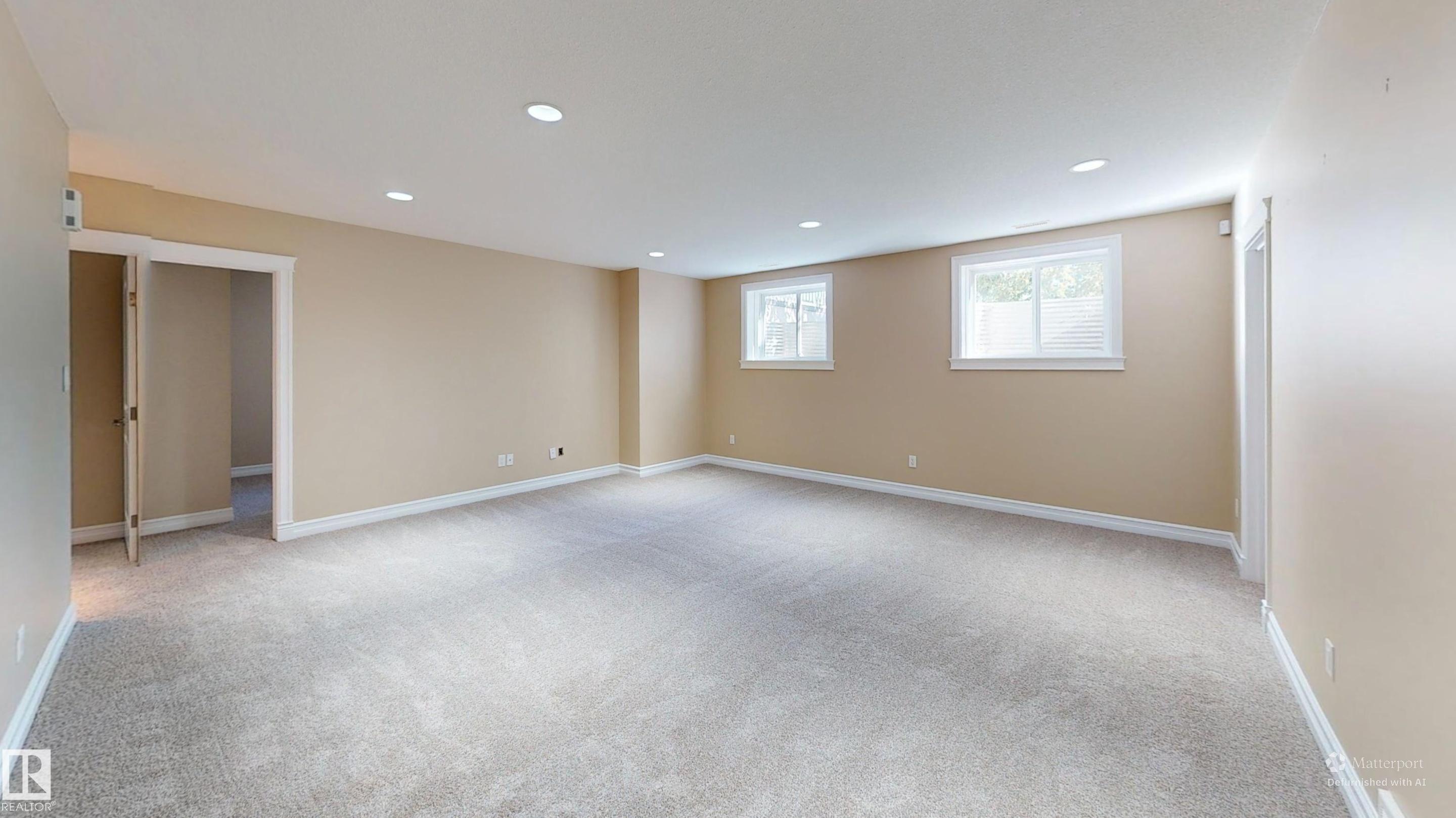 Welcome to this stunning Custom Built Executive Bungalow in Edmonton's West End! From the exposed aggregate driveway to the luxury finishes throughout, this home impresses at every turn. The open-concept main floor is perfect for entertaining, featuring a gourmet kitchen with rich cabinetry, quartz countertops, and high-end stainless steel appliances. The living room showcases a cozy fireplace and built-in shelving, with oversized windows flooding the space with natural light. Retreat to the spa-like primary suite with a soaker tub, walk-in shower, and generous storage. With a large Family Room, 3 additional bedrooms plus a dedicated home office, and ample storage this layout is ideal for families or professionals. Hardwood floors, brand new plush carpeting, and thoughtful details add both elegance and comfort. Designed for modern living, this property blends style, function, and luxury into one exceptional package. Don't miss your chance to own this remarkable home!