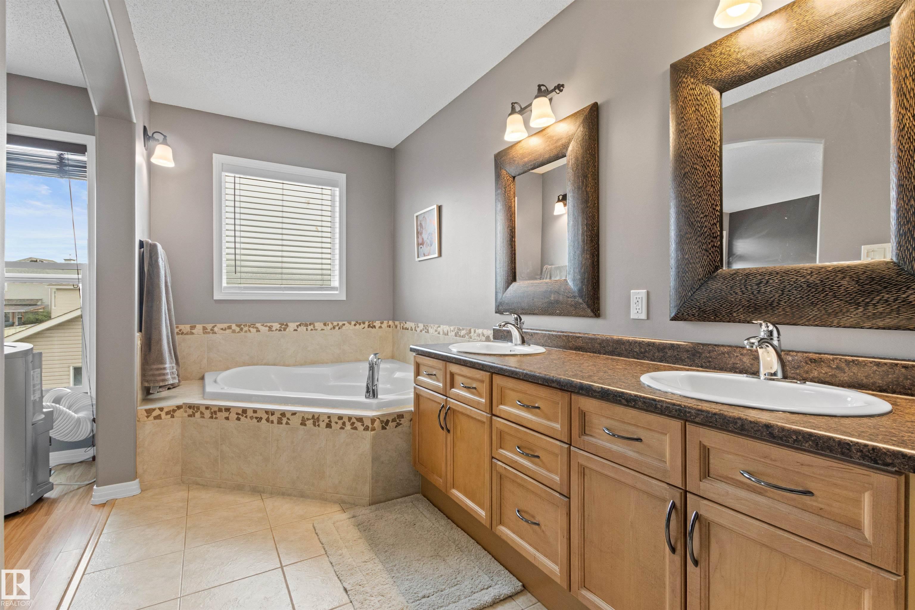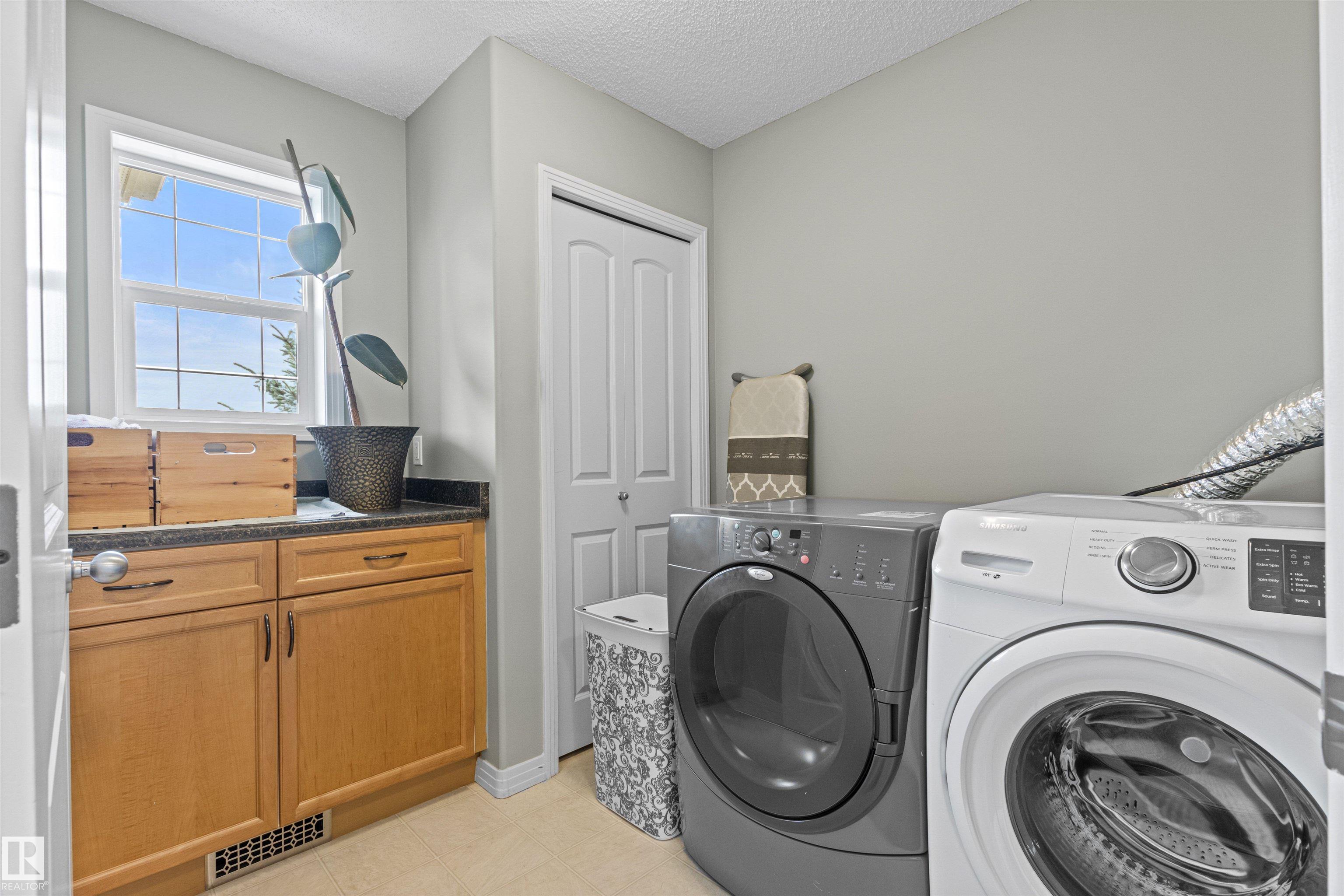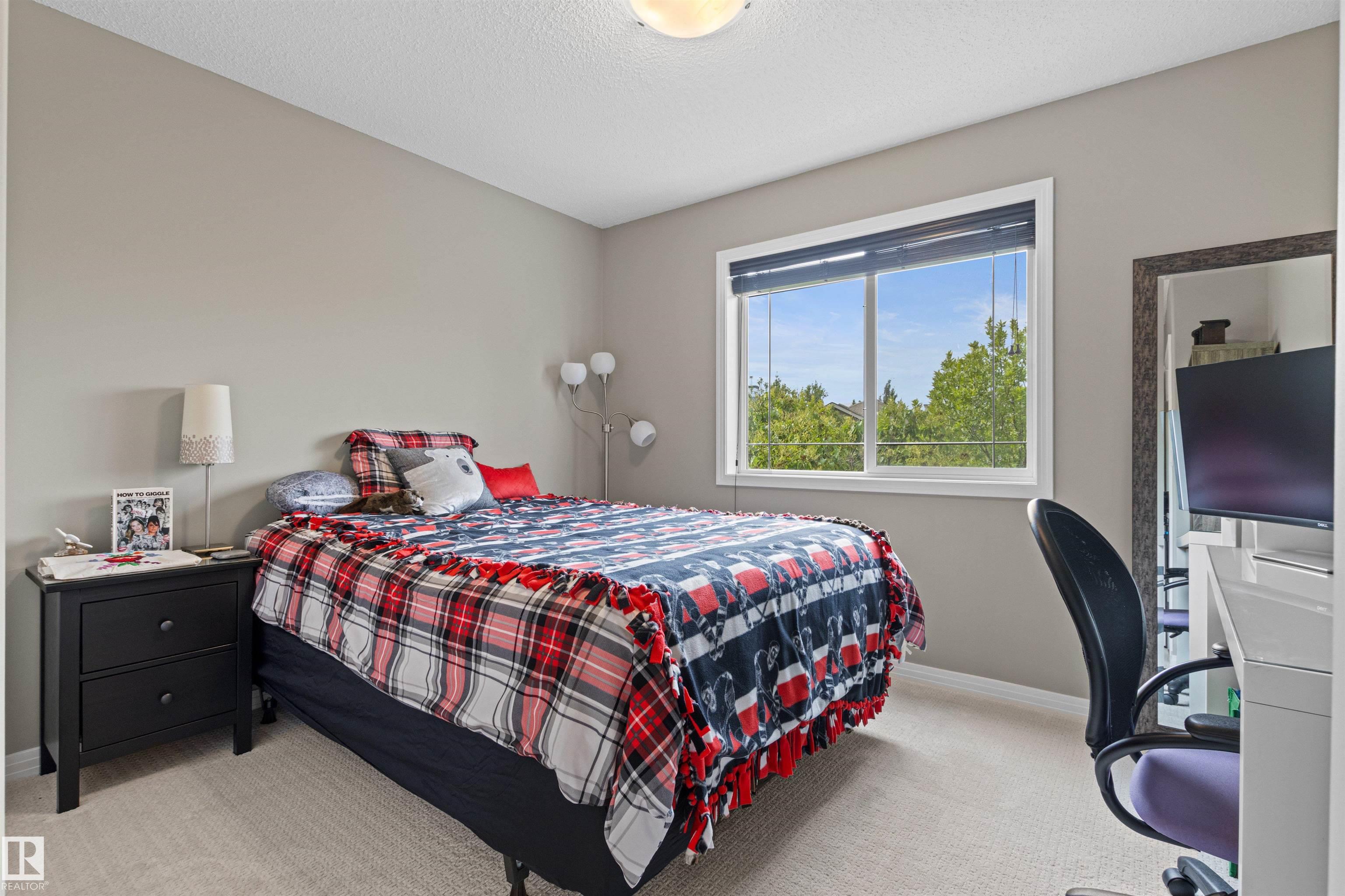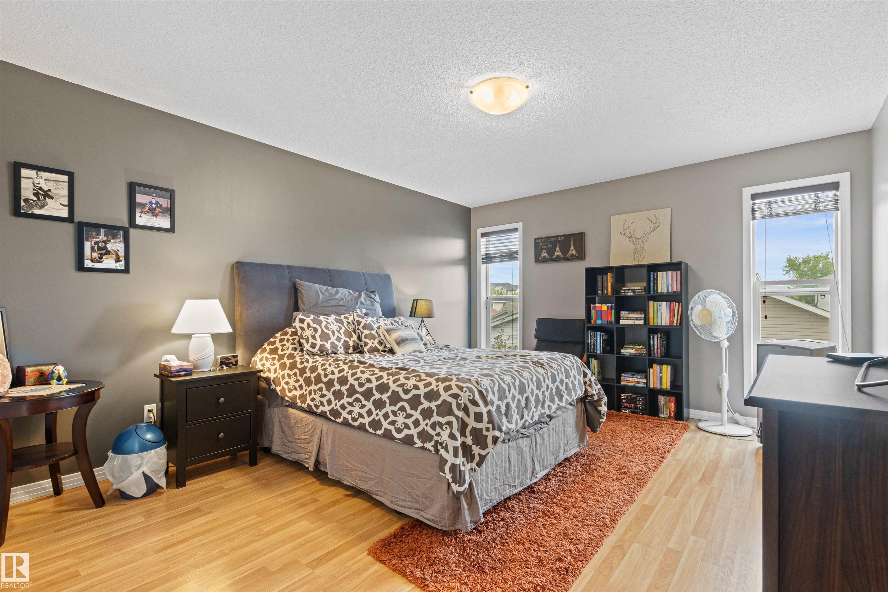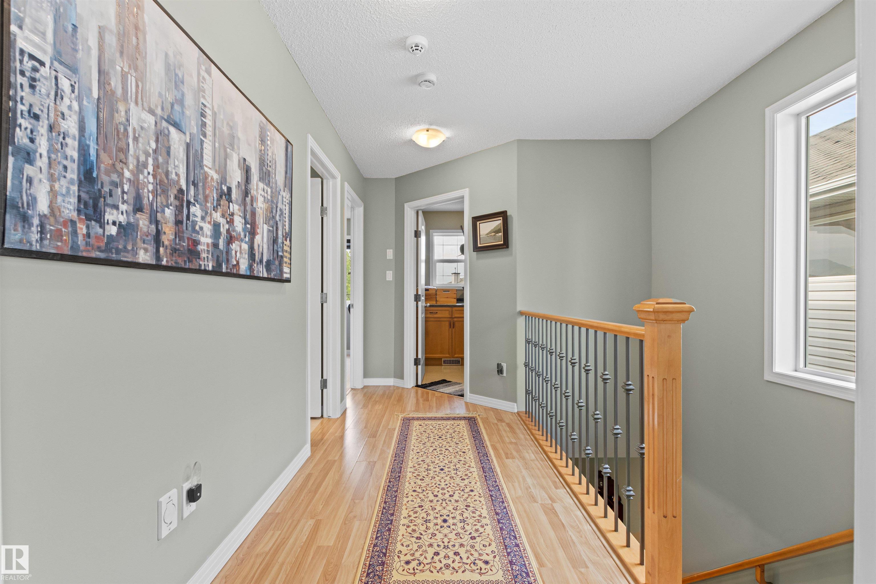 This home is located on a quiet cul-de-sac in Suder Greens. Perfectly maintained, 4 bdrm., 4 bathroom two storey is finished top to bottom. Front flex-room can either be a bedroom or a bright office. Open kitchen, dining room and family room with fireplace. Primary suite with large walk-in closet, double vanity and jetted corner tub ensuite. An additional 4 piece bathroom on the 2nd floor as well as, a 2nd bedroom and large bonus laundry room. The fully finished basement features 9 ft. ceilings and in-floor heat throughout. The home has a 70 gallon hot water tank, & central vac. Oversized double garage with large attic storage space accessible by the pull down stairs. Deck and pergola finish off the backyard. New roof May 2023, dishwasher/2020, microwave hood fan/2020.